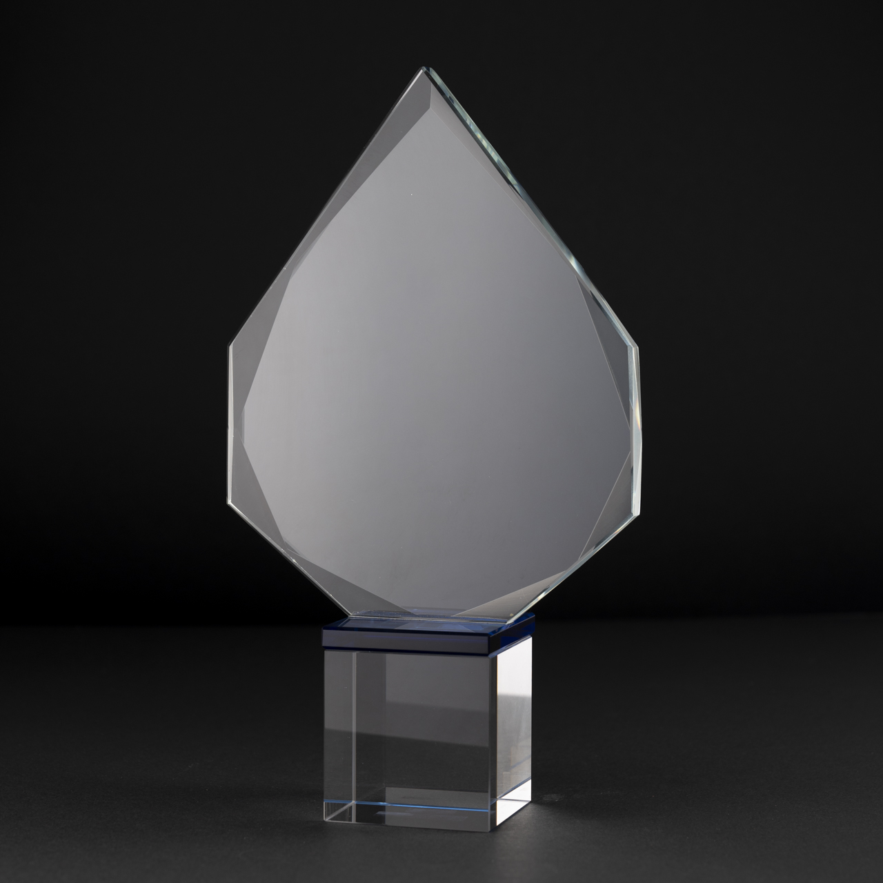 Our arrowhead glass award features an arrowhead piece of glass for laser engraving personalization mounted on a blue & clear crystal base.