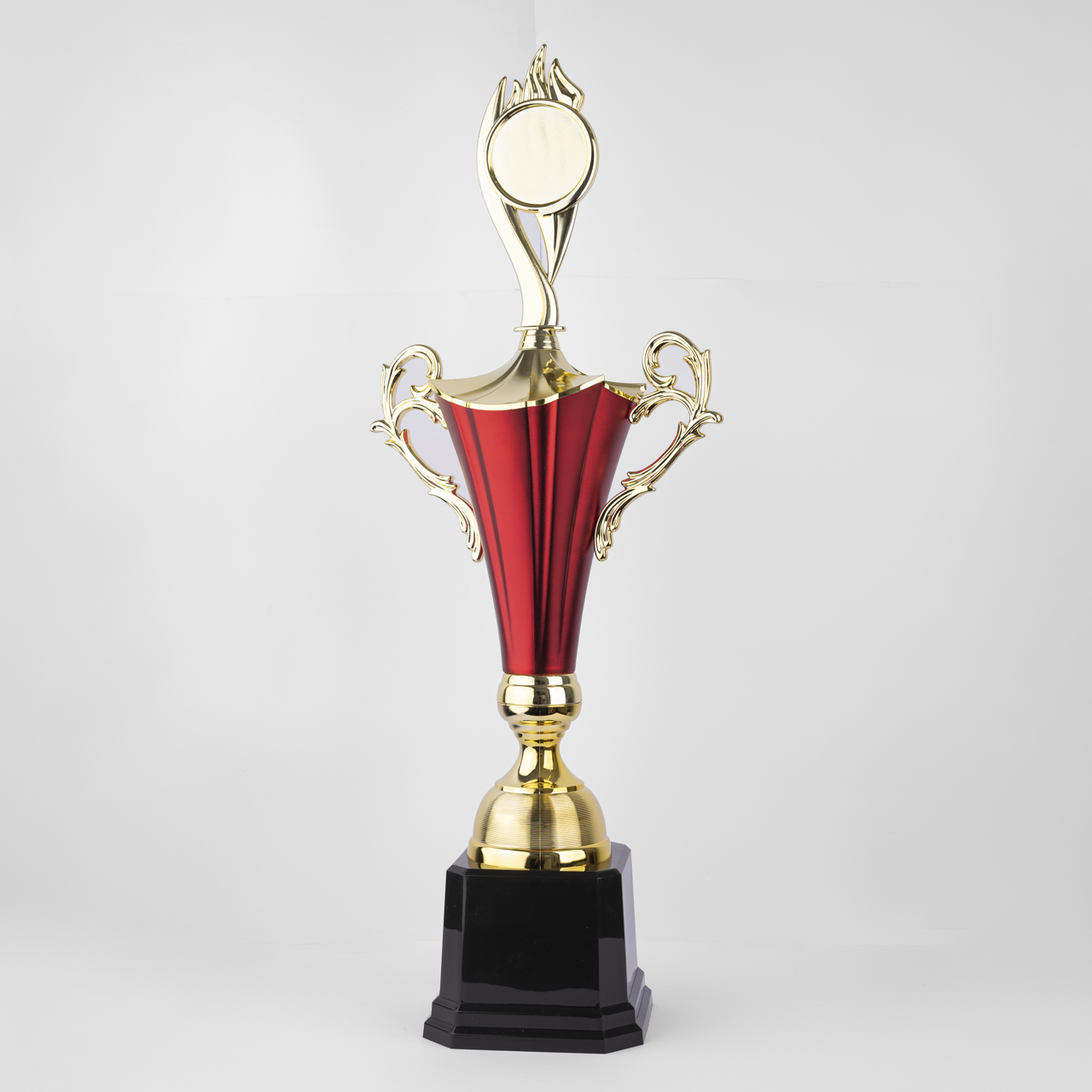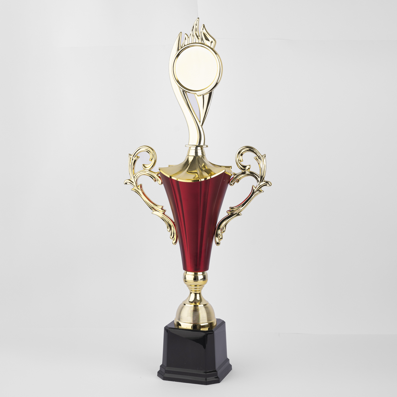 Introducing the Brazilian Elegance Red Trophy, a stunning award that embodies modern sophistication. This trophy features a sleek black stand, providing a strong and stylish foundation. Rising from the stand is a round gold stem, adding a touch of refinement. Atop the stem sits a beautifully crafted red and gold cup, designed with elegant handles that draw inspiration from delicate leaves, giving it a unique and artistic flair. Finished with a stylish riser on top, the Brazilian Elegance Trophy is perfect for celebrating outstanding achievements, making it a timeless symbol of excellence and recognition.