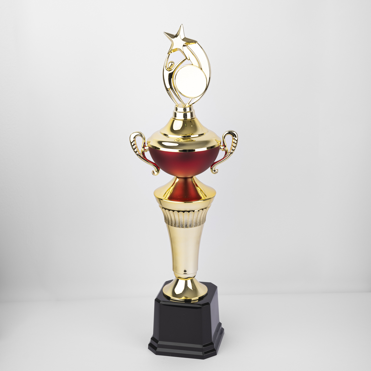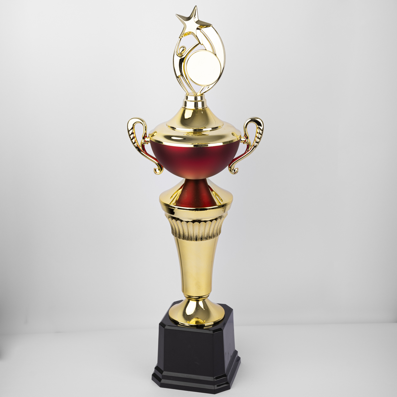 Introducing the Brazilian Star Award, a striking trophy that beautifully celebrates excellence. This award features a sturdy black base, creating a bold foundation for its design. Atop the base rises a finely detailed gold stem, elegantly crafted to catch the eye. Sitting proudly above is a short yet wide modern cup in a rich satin red and gold finish, complete with stylish handles that enhance its contemporary look. Capping off the design is a 2″ circular riser adorned with stars, adding a touch of brilliance and recognition. The Brazilian Star Award is perfect for honoring outstanding achievements, making it a treasured symbol of success in any field. Available in 3 sizes.