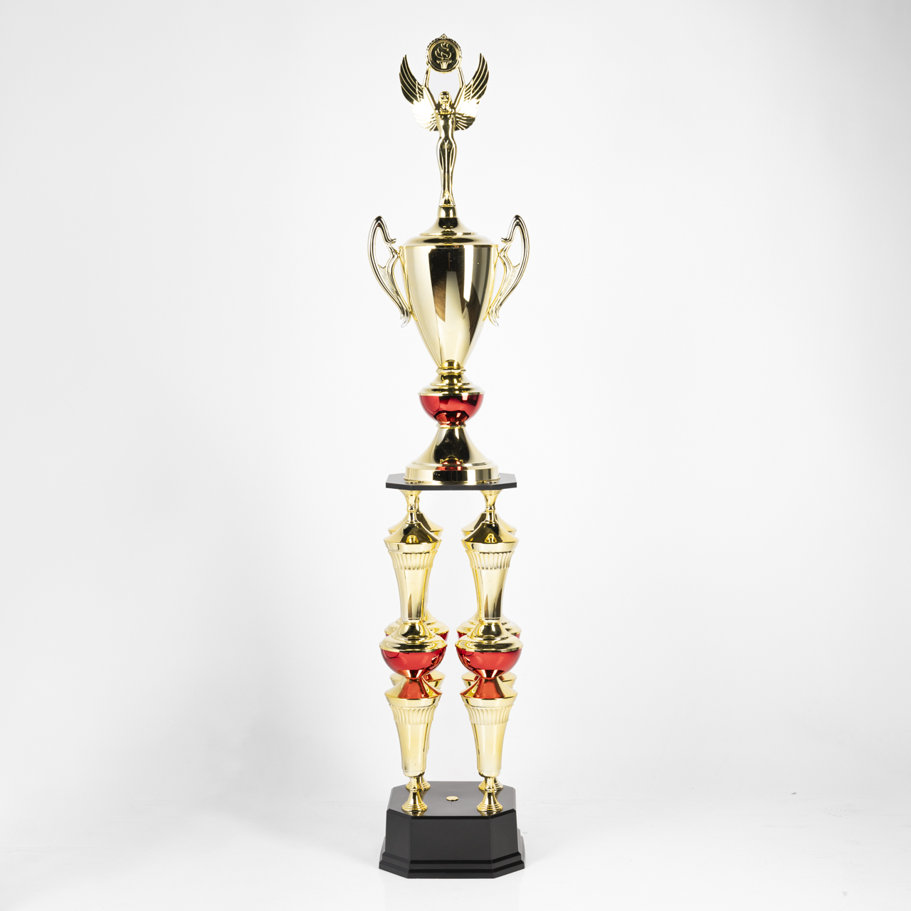 This impressive Brazilian made trophy stands tall and commanding, showcasing a layered design that exudes grandeur. Set on a large black base for stability, it features four elegant gold stems adorned with sleek red details, creating a striking contrast that enhances its stature. Atop this majestic structure sits a gleaming gold cup, symbolizing triumph, complemented by a victory riser that adds an extra touch of distinction. This trophy is a stunning representation of achievement, perfect for celebrating significant accomplishments and making a bold statement at any award ceremony.