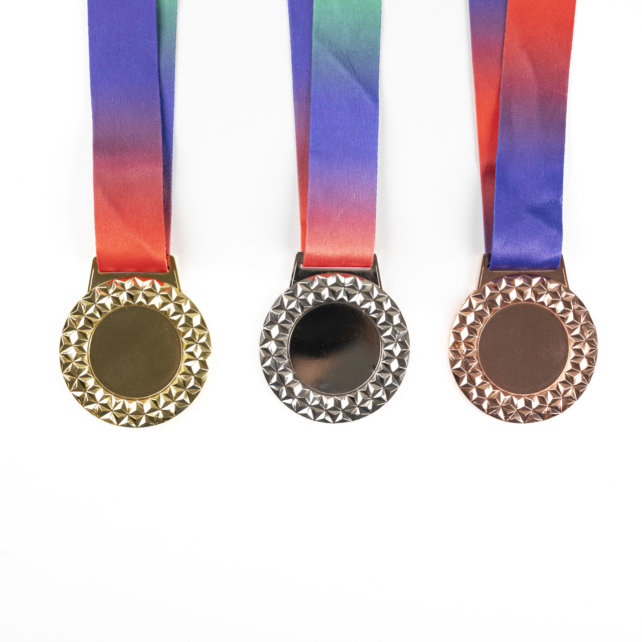 The Celestial Honor Medals, available in gold, silver, and bronze, feature a circular insert space framed by a star-patterned outer border. Each medal comes with a vibrant rainbow ribbon, making them perfect for recognizing outstanding achievements in any event!