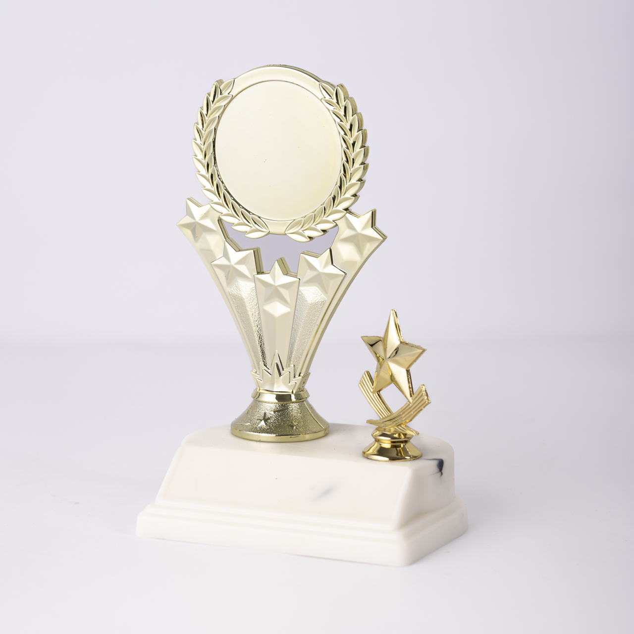 The Celestial Honors Trophy features a sleek white base with a small star riser on one side, while the other side showcases five stars shooting upward in a semi-circle, elegantly cradling a wreath that holds a 2-inch circular insert. This trophy symbolizes outstanding accomplishments and the pursuit of excellence, making it a perfect award to honor those who shine brightly in their endeavors.