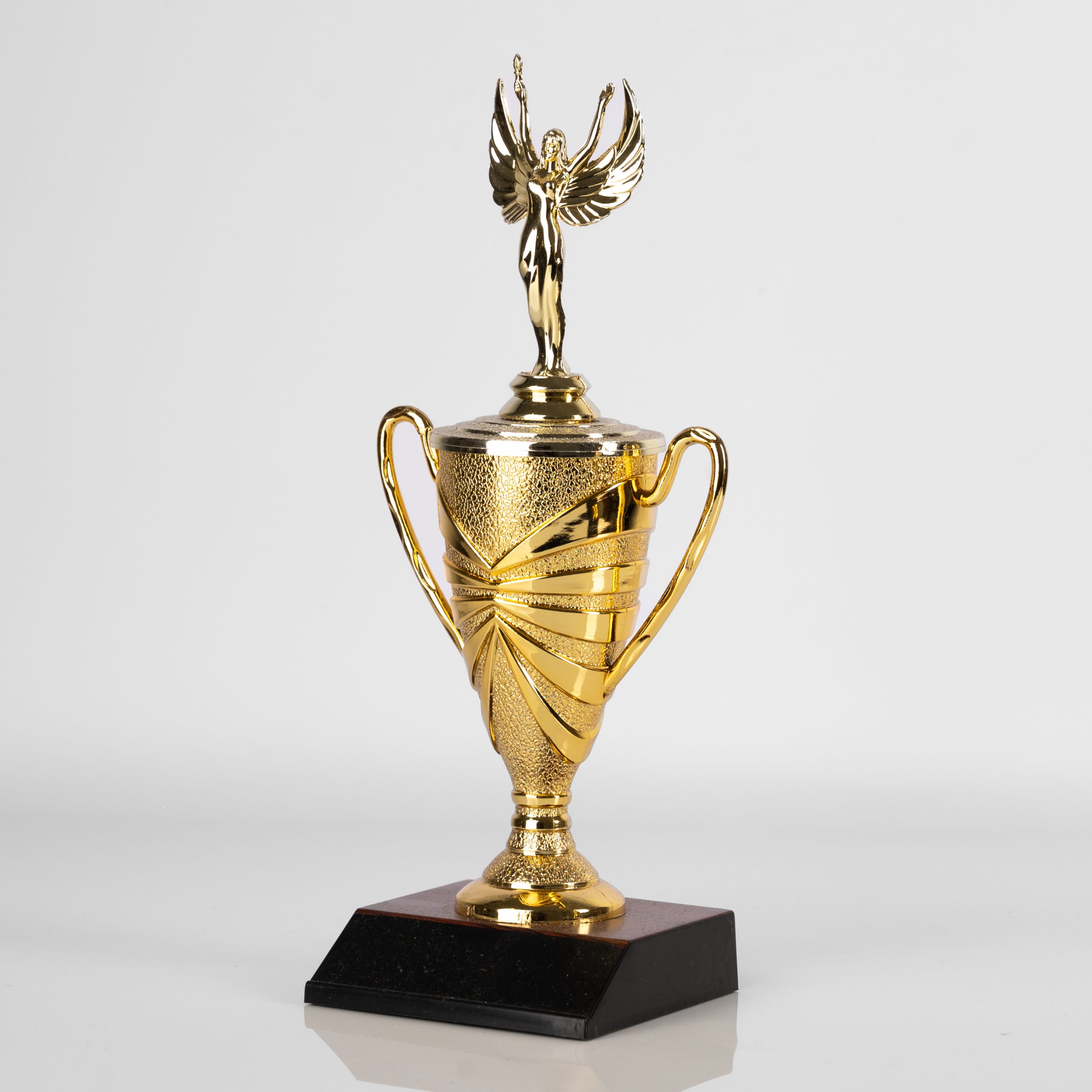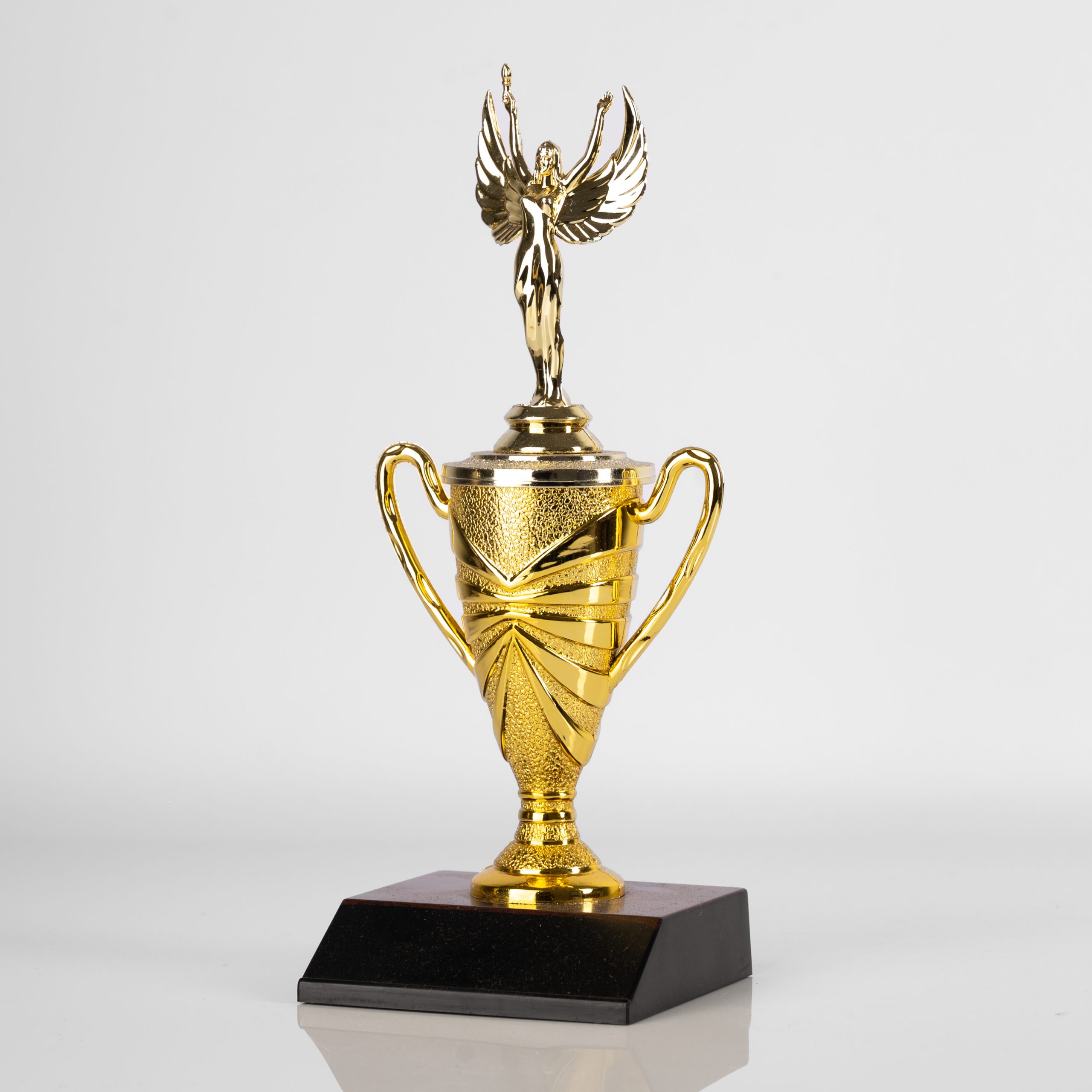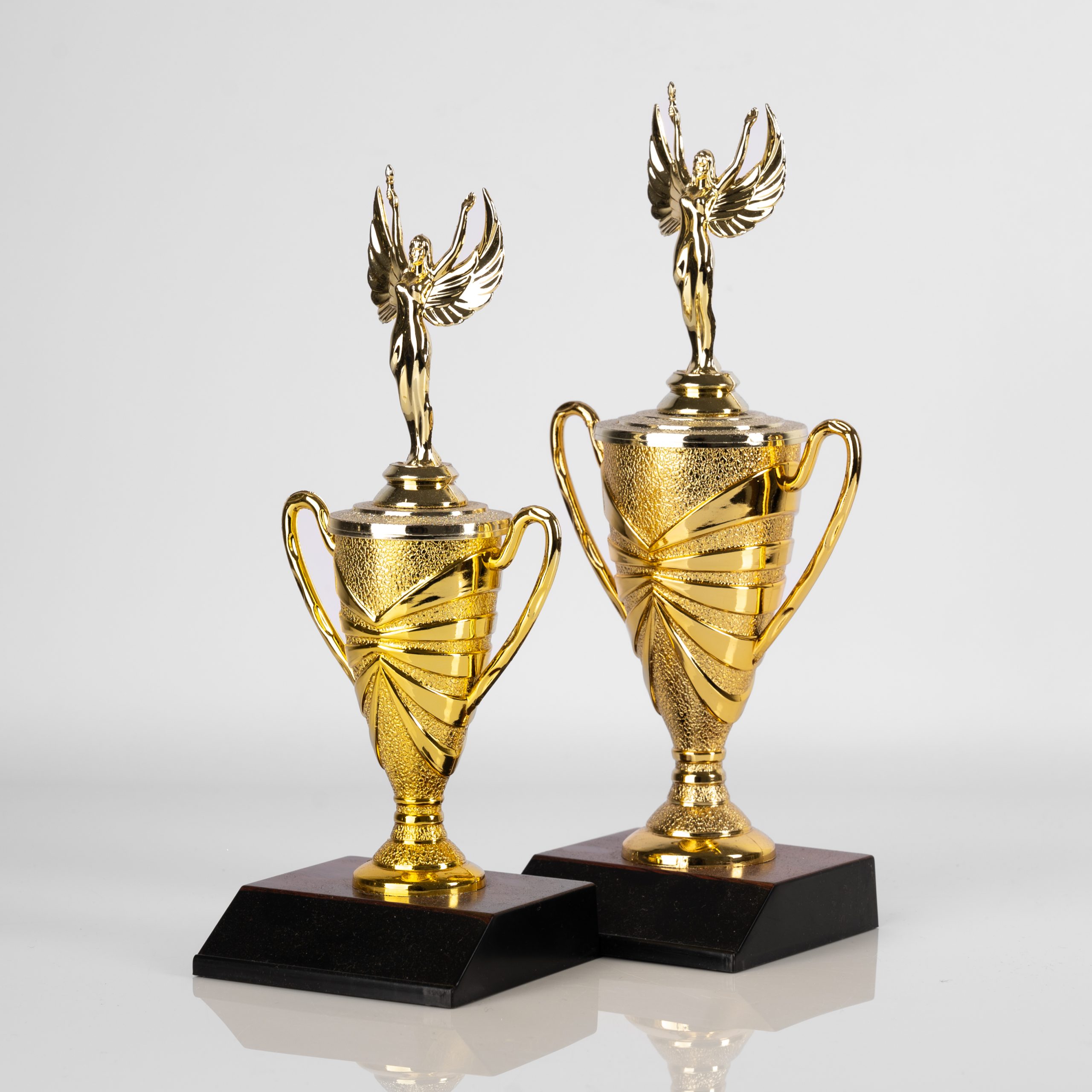 Majestic golden trophies crowned with a radiant winged figure, embodying the grace, strength, and unwavering determination of true victors.