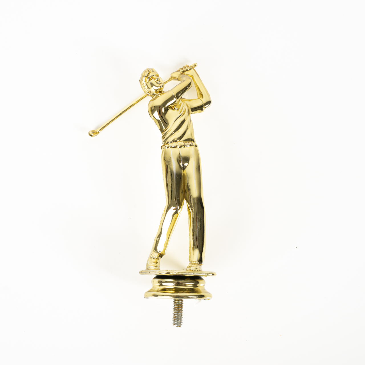 The Gold Golf Swing Riser showcases a dynamic figure—male or female—striking a golf ball with a club raised overhead. This elegant riser captures the spirit of golf, making it a perfect centerpiece for awards ceremonies celebrating golfing achievements!
