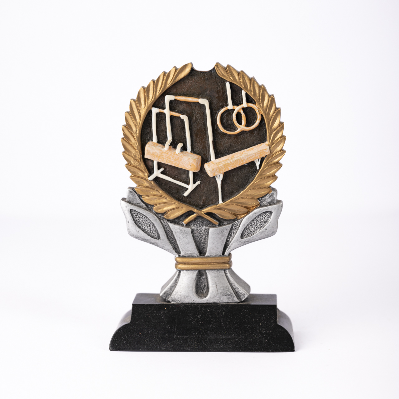 This resin trophy features a painted relief of gymnastic equipment set in the center of a garland circle, elegantly mounted on a silver pedestal. Perfect for celebrating gymnasts who have shown significant improvement or as a participation trophy for a gymnastics event, this award is a graceful way to recognize dedication and achievement in the sport.
