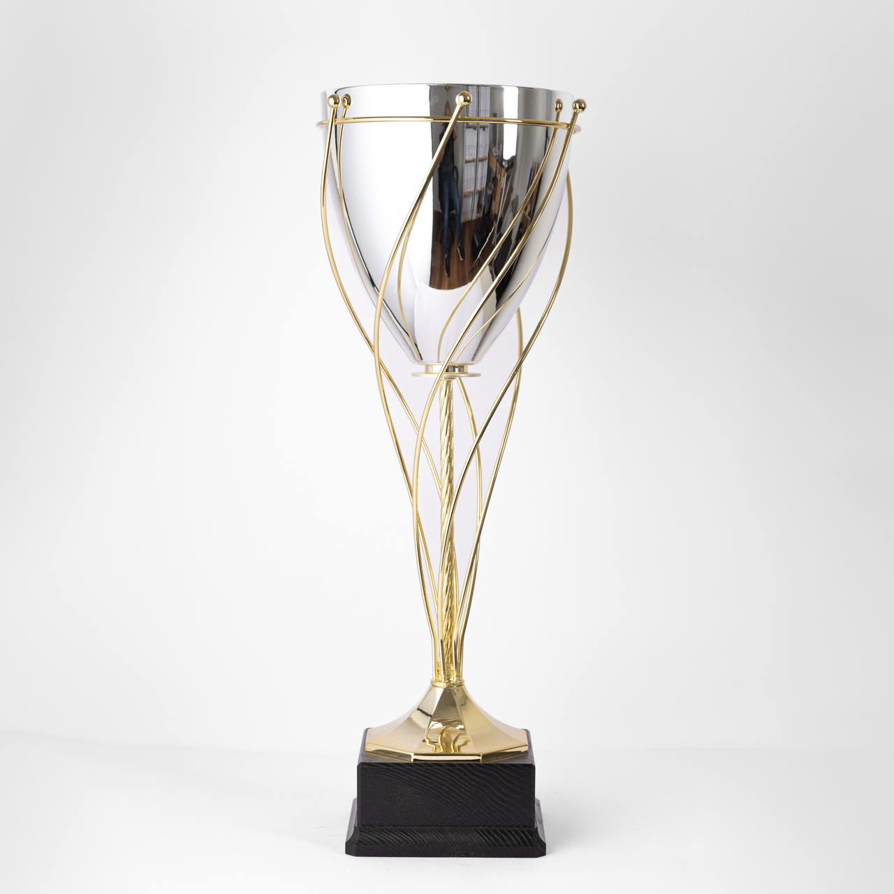This stunning trophy features a sleek silver metal cup beautifully complemented by a unique gold-plated swirly metal structure that adds an artistic flair. The graceful curves of the design symbolize movement and excellence, making it a striking centerpiece. The trophy is anchored by a solid black oak wooden base, providing stability and a classic contrast to the gleaming finishes. Crafted in Italy, this trophy perfectly embodies sophistication and celebration, making it an ideal award for honoring exceptional achievements.