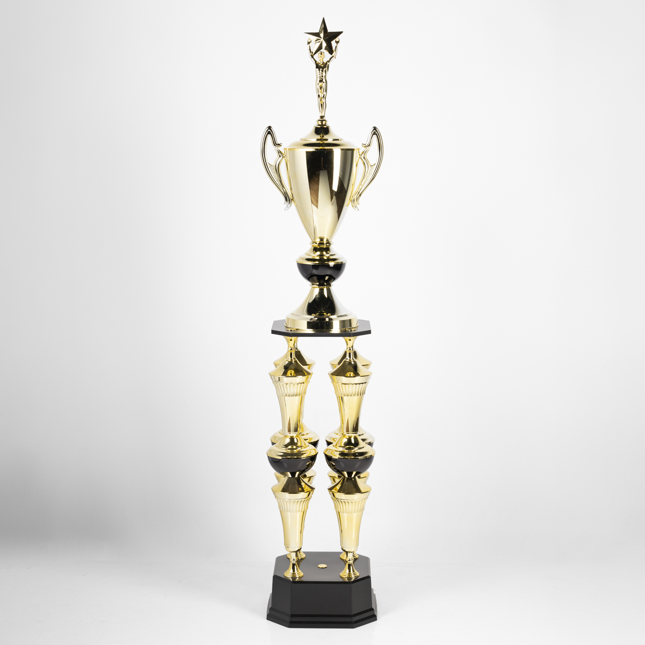 This impressive Brazilian made trophy stands tall and commanding, showcasing a layered design that exudes grandeur. Set on a large black base for stability, it features four elegant gold stems adorned with sleek black details, creating a striking contrast that enhances its stature. Atop this majestic structure sits a gleaming gold cup, symbolizing triumph, complemented by a victory riser that adds an extra touch of distinction. This trophy is a stunning representation of achievement, perfect for celebrating significant accomplishments and making a bold statement at any award ceremony.