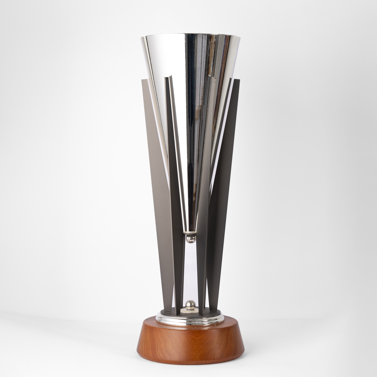 This elegant trophy features a striking silver-plated metal cup enveloped by a contemporary black titanium structure that adds a modern touch and a sense of depth. The contrasting materials create a sophisticated interplay between shiny and matte finishes, enhancing the trophy’s visual appeal. Set on a sturdy cherry wooden base, this award provides a solid foundation while maintaining a sleek and polished look. Crafted in Italy, this trophy is an exceptional representation of achievement and style, making it a perfect choice for honoring distinguished accomplishments.