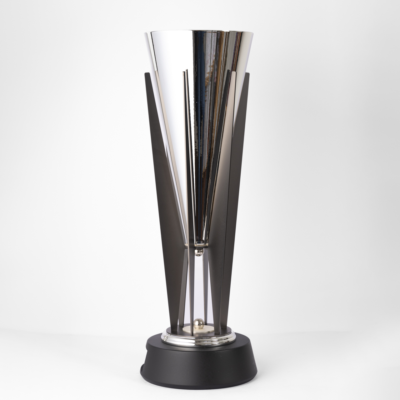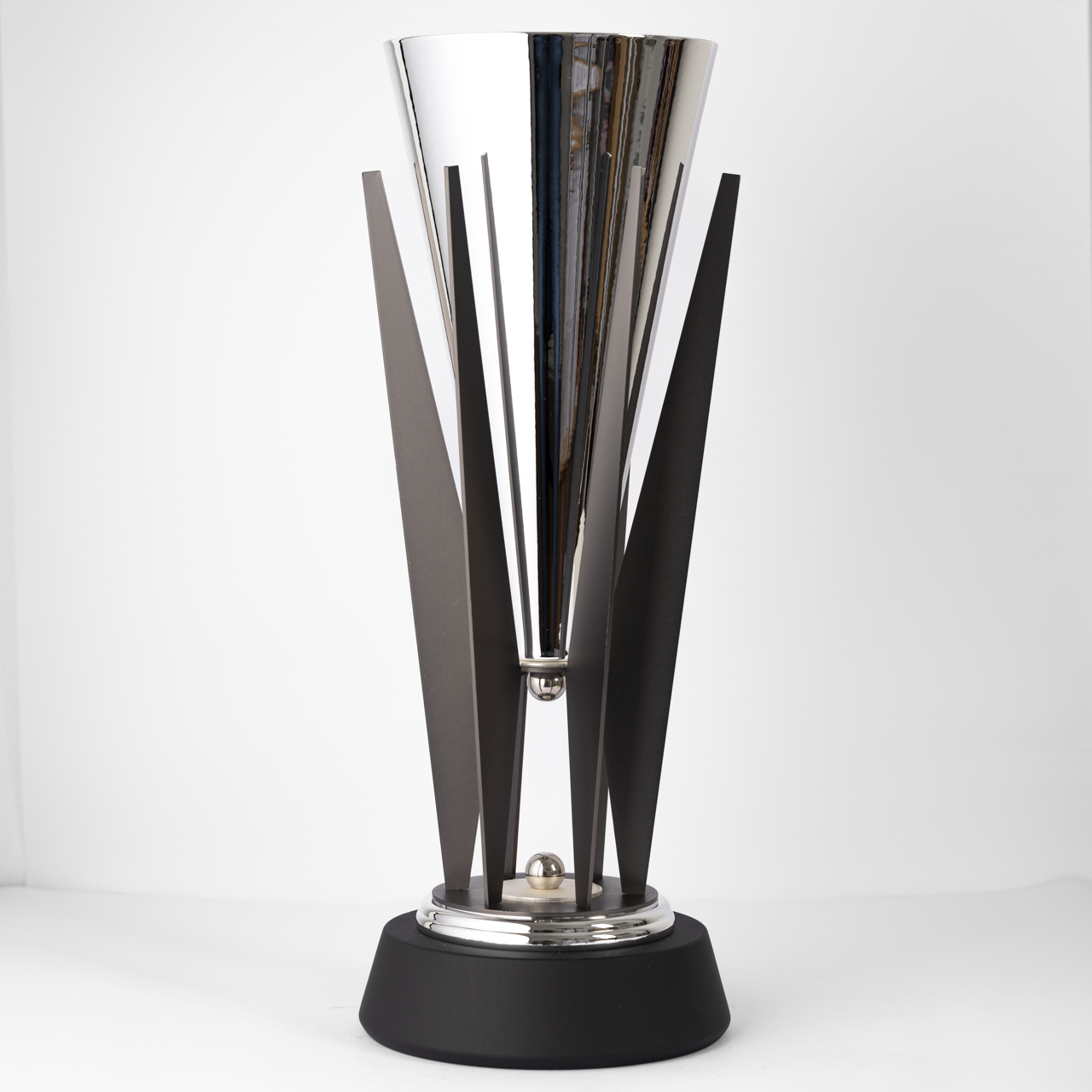 This elegant trophy features a striking silver-plated metal cup enveloped by a contemporary black titanium structure that adds a modern touch and a sense of depth. The contrasting materials create a sophisticated interplay between shiny and matte finishes, enhancing the trophy’s visual appeal. Set on a sturdy black wooden base, this award provides a solid foundation while maintaining a sleek and polished look. Crafted in Italy, this trophy is an exceptional representation of achievement and style, making it a perfect choice for honoring distinguished accomplishments.