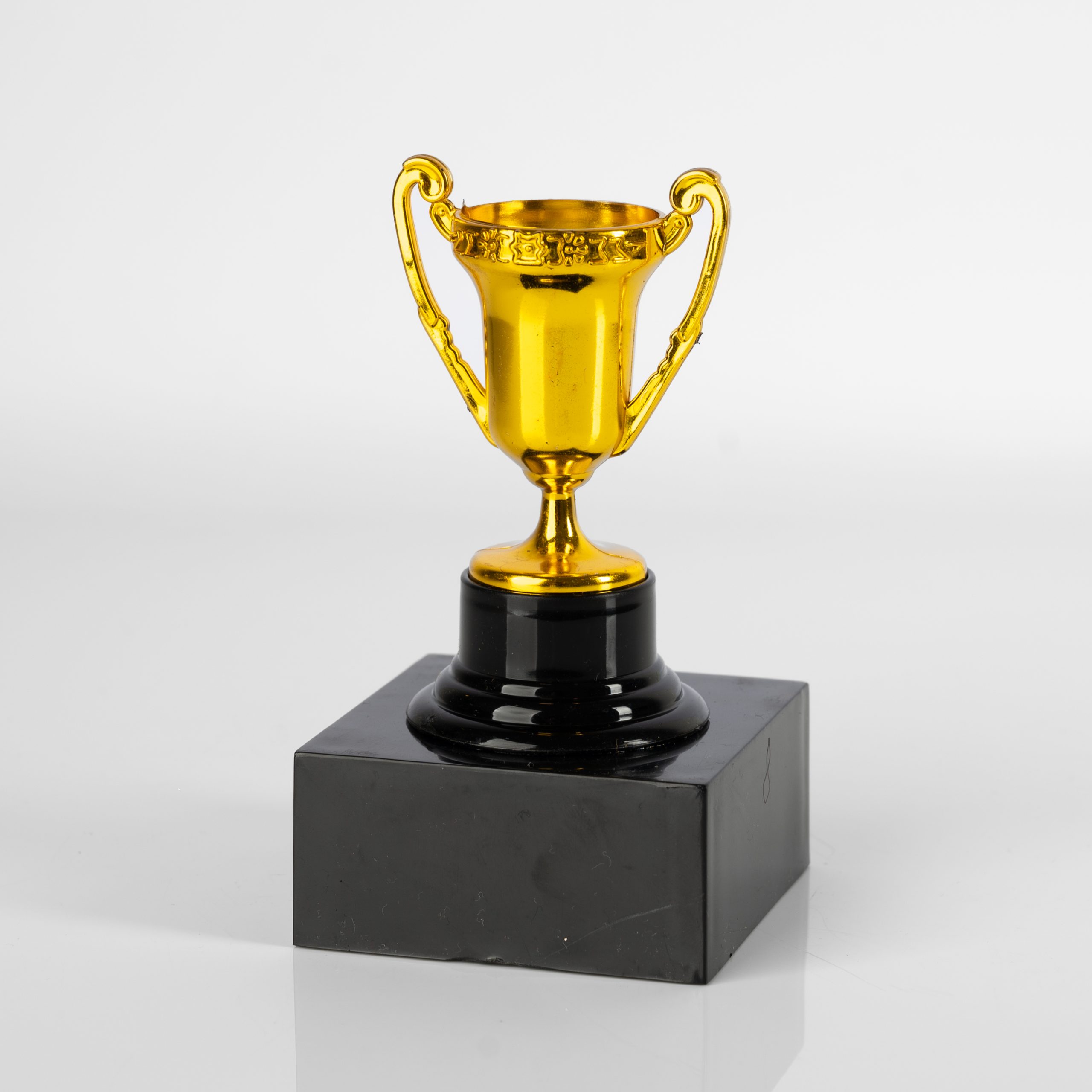 A tiny titan of triumph, this pint-sized golden trophy stands boldly atop its grand black pedestal, proving that true greatness isn’t measured in size, but in spirit.