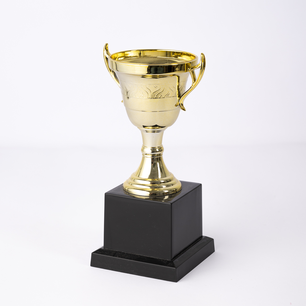 This trophy cup is perfect for celebrating special achievements! It features small handles and a charming border, resting on a compact black base. Ideal for kids’ events, sports competitions, or any occasion that calls for a touch of cheer. Celebrate success with this delightful trophy!