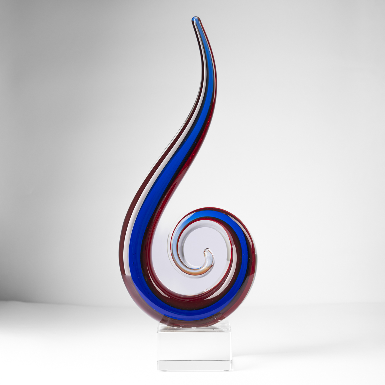 The Peppermint Swirl Art Glass Award features a distinctive crystal piece with a captivating swirl pattern in red, blue, and clear hues.