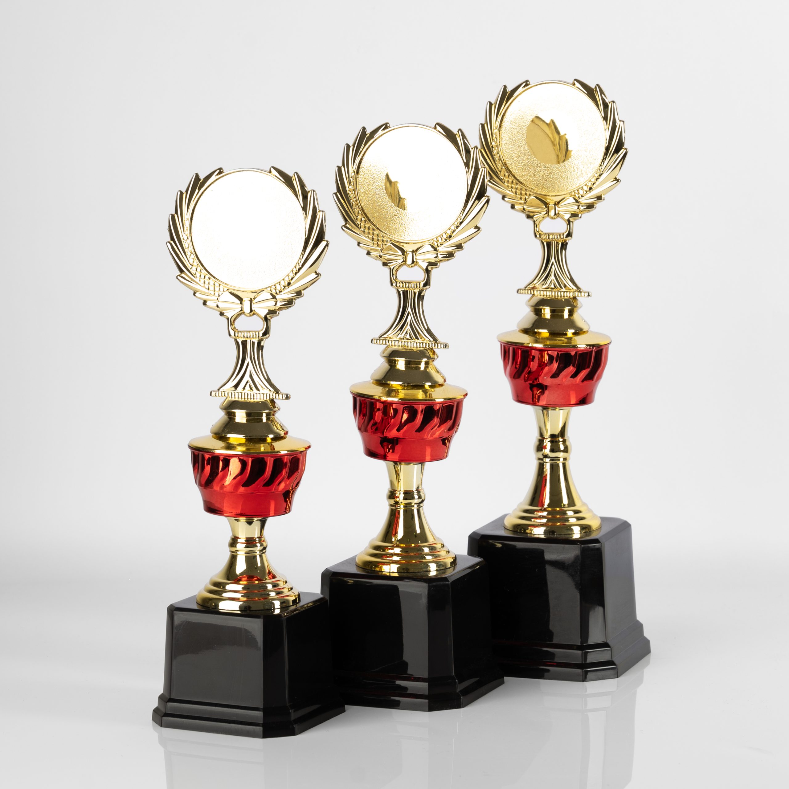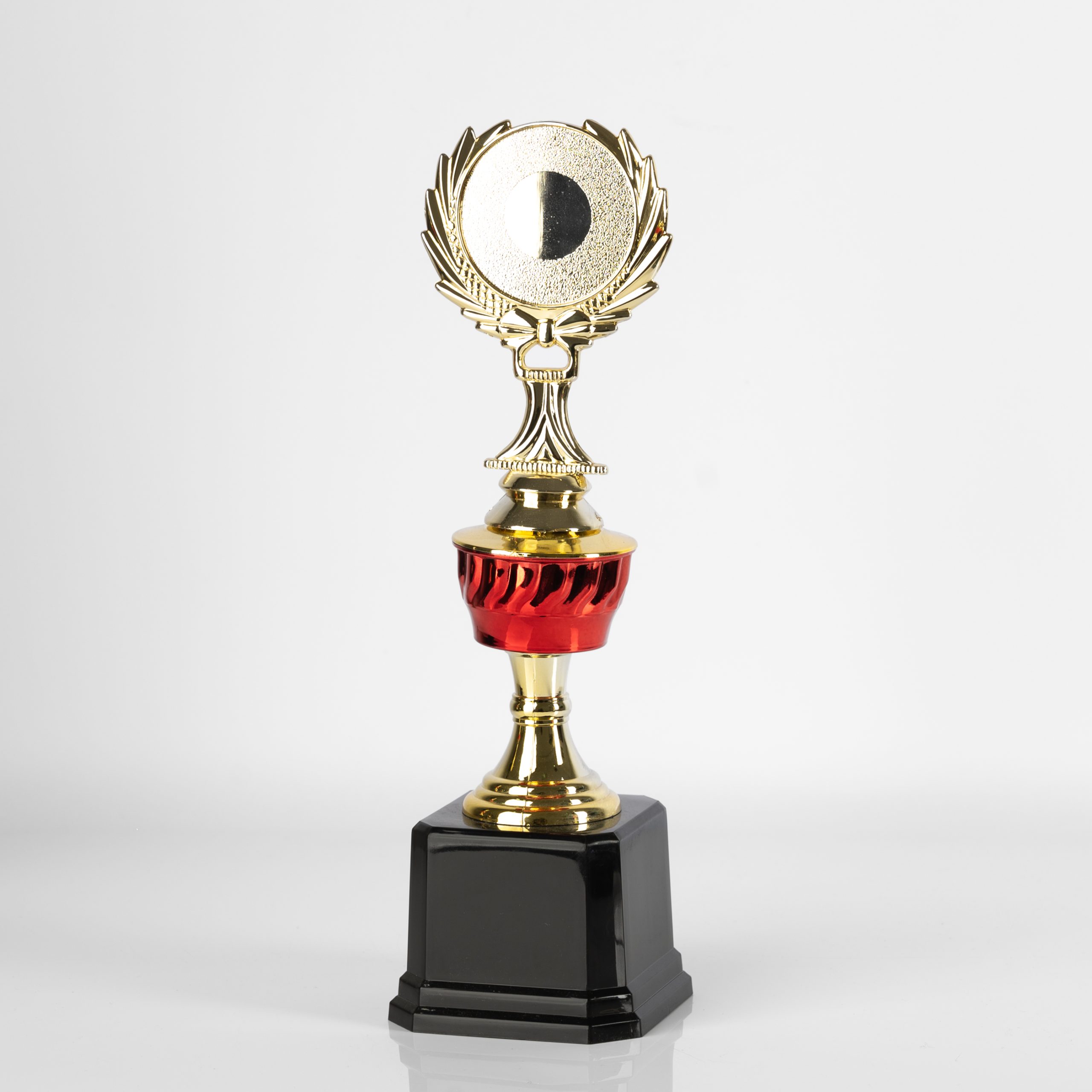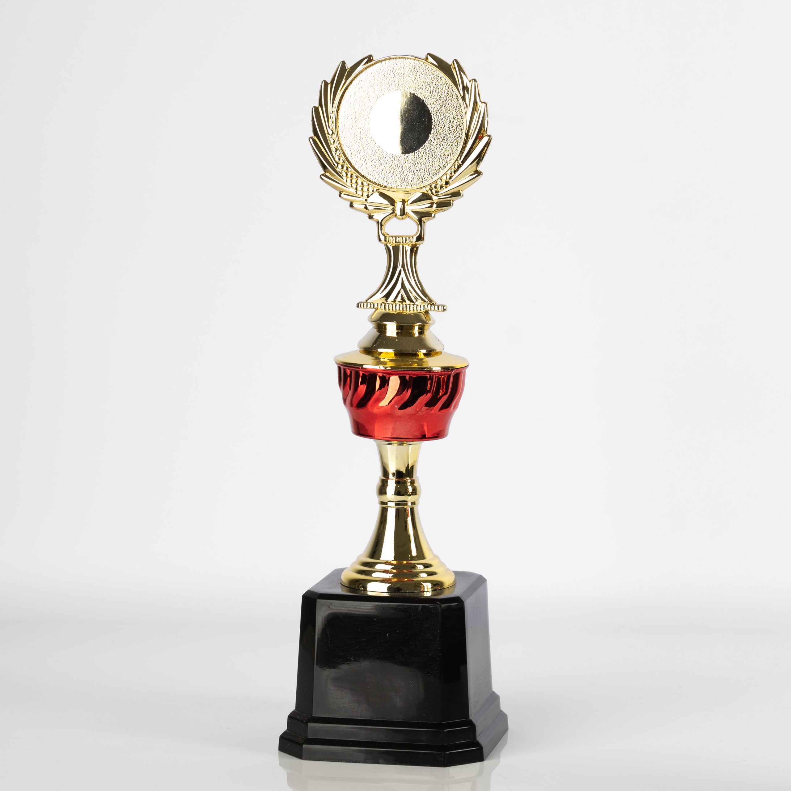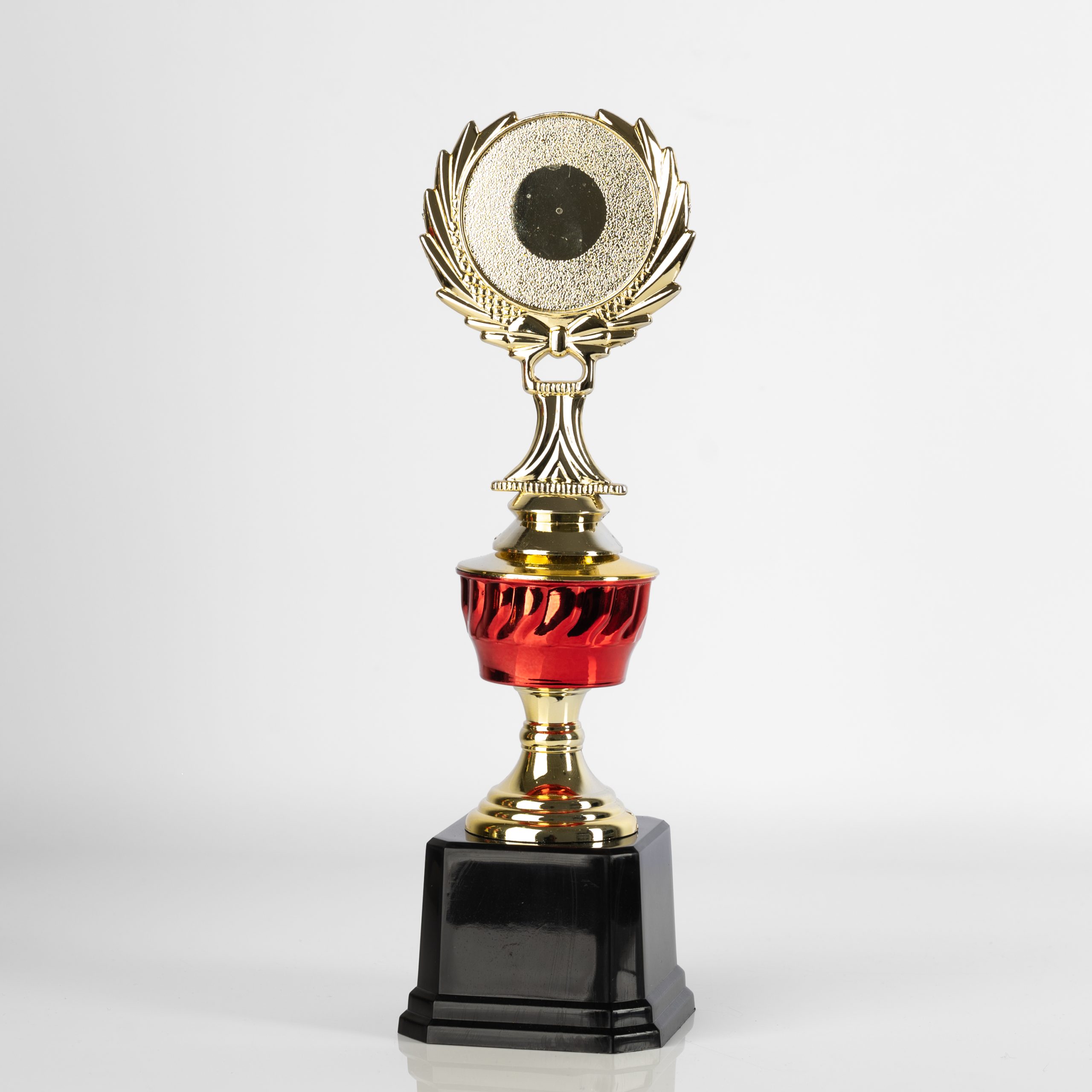 Introducing the Eminence Award! This elegant trophy features a sleek black base topped with a shimmering gold pedestal. Atop the pedestal, a vibrant red piece showcases a beautifully crafted wreath bow riser, adding a touch of sophistication. Perfect for recognizing outstanding accomplishments, this award blends style and distinction, making it an ideal choice for any ceremony or event. Celebrate success with this stunning tribute to excellence!