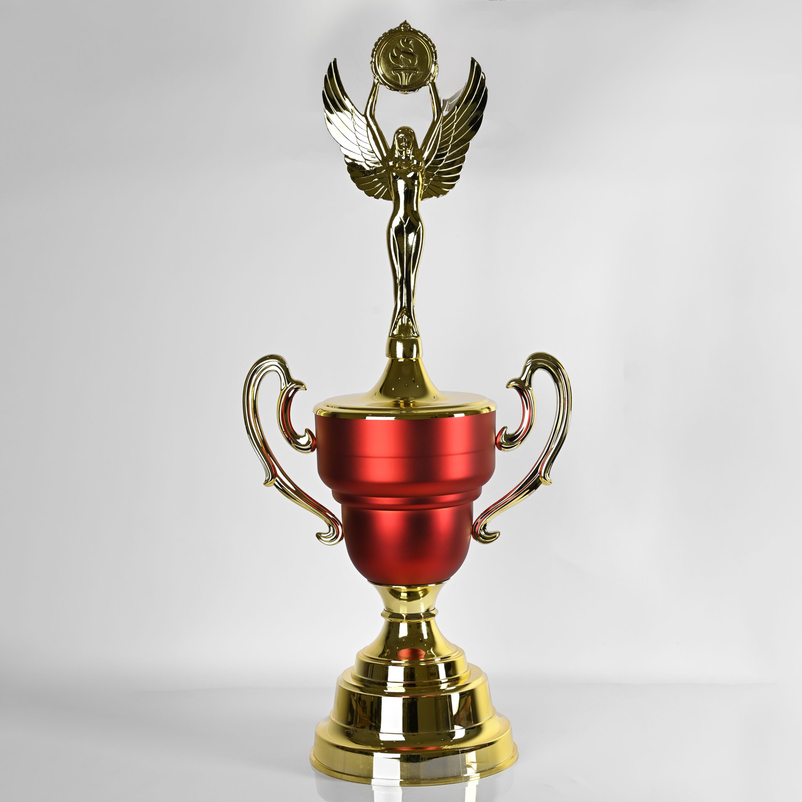 Introducing the Red Triumph Trophy! This striking award features a large gold round base supporting a stunning red cup with intricately designed gold handles adorned with leaf details. Topped with a bold gold victory riser, this trophy embodies the spirit of achievement and is perfect for honoring significant accomplishments in sports or competitions. Celebrate excellence with this impressive tribute!