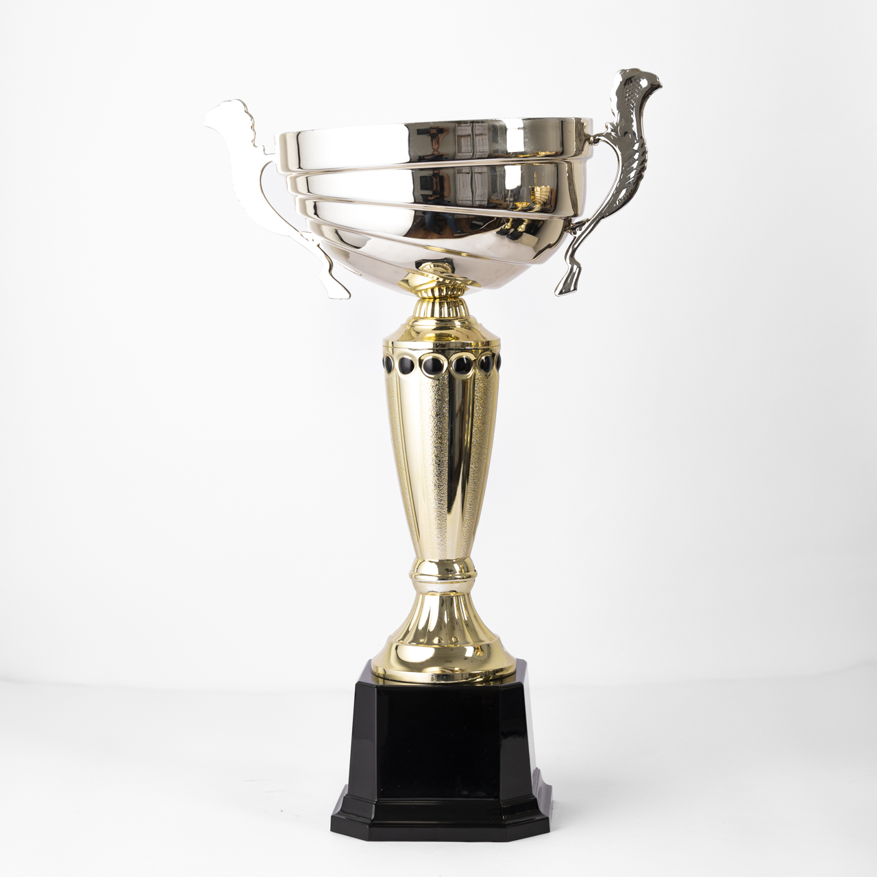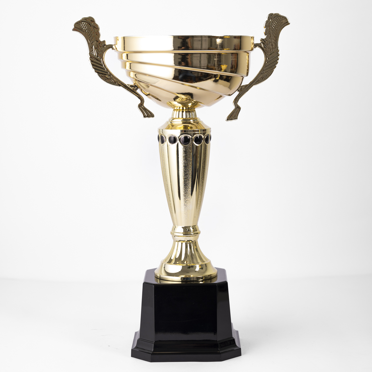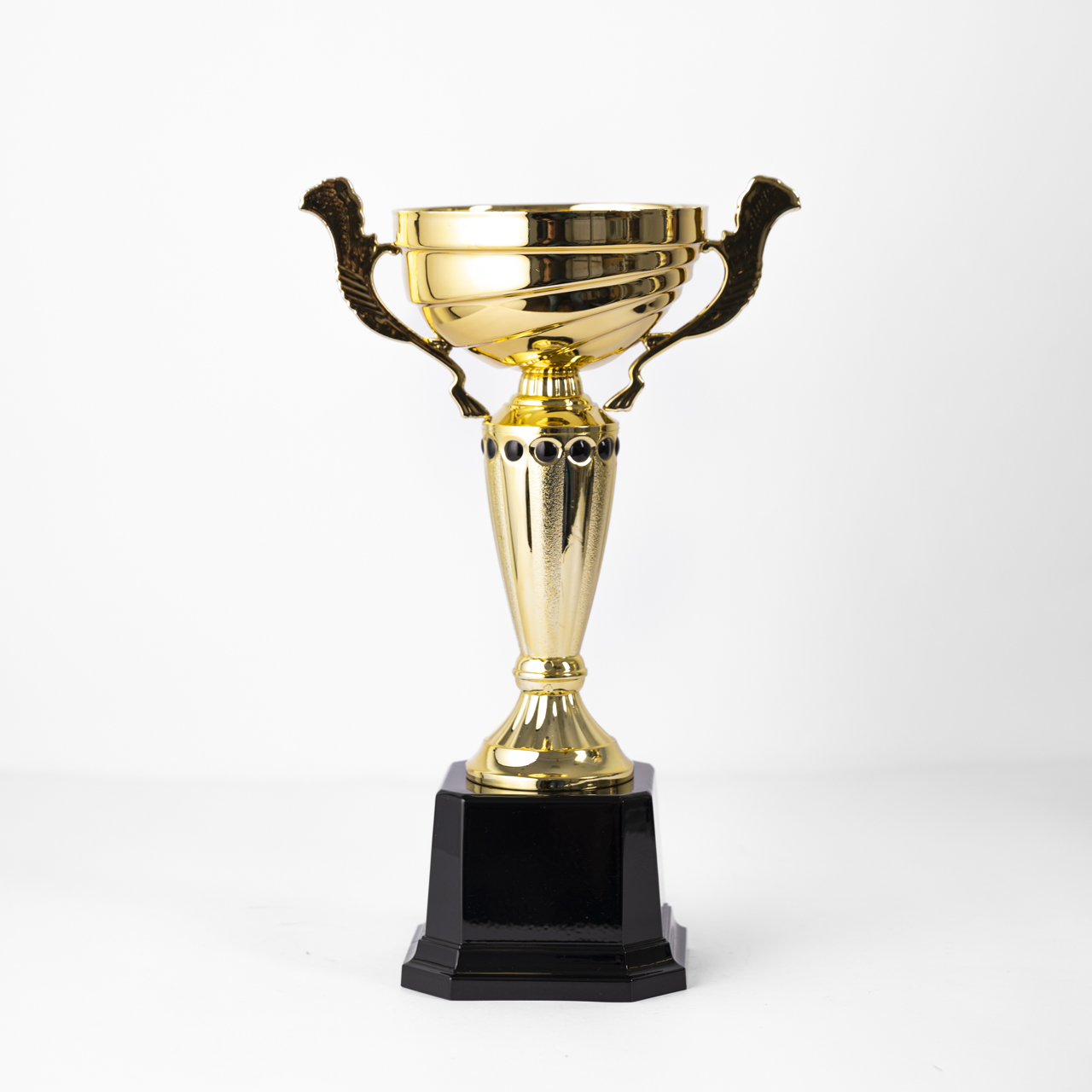 The Regal Honor Trophy represents elegance and distinction. Its square black plastic base is complemented by a gold stem adorned with intricate black details. The shallow gold cup, featuring flat, stylish handles, makes this trophy a perfect tribute to outstanding achievement.