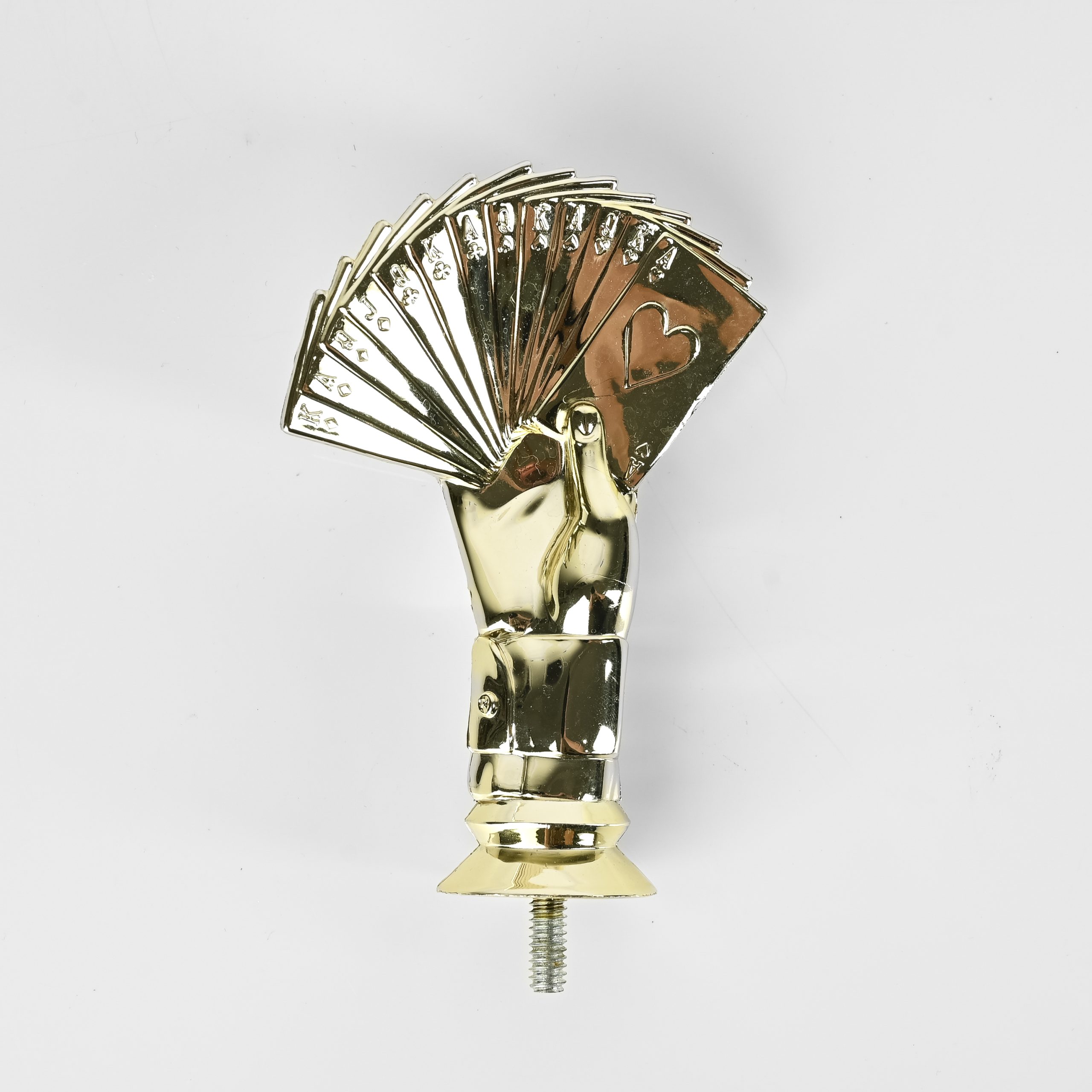 A gold riser featuring a hand holding a deck of cards, symbolizing skill, strategy, and mastery in the art of the game.