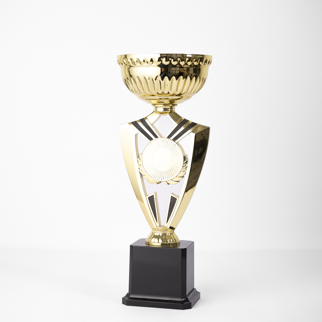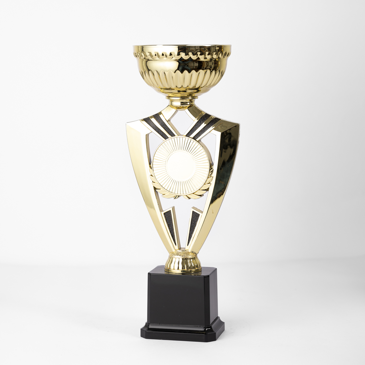 Shielded Gold Triumph is a black plastic square base supporting a gold shield-shaped cutout for the stem, with a circle in the center featuring intricate black details. Atop the shield stands a gleaming gold cup symbolizing victory.
