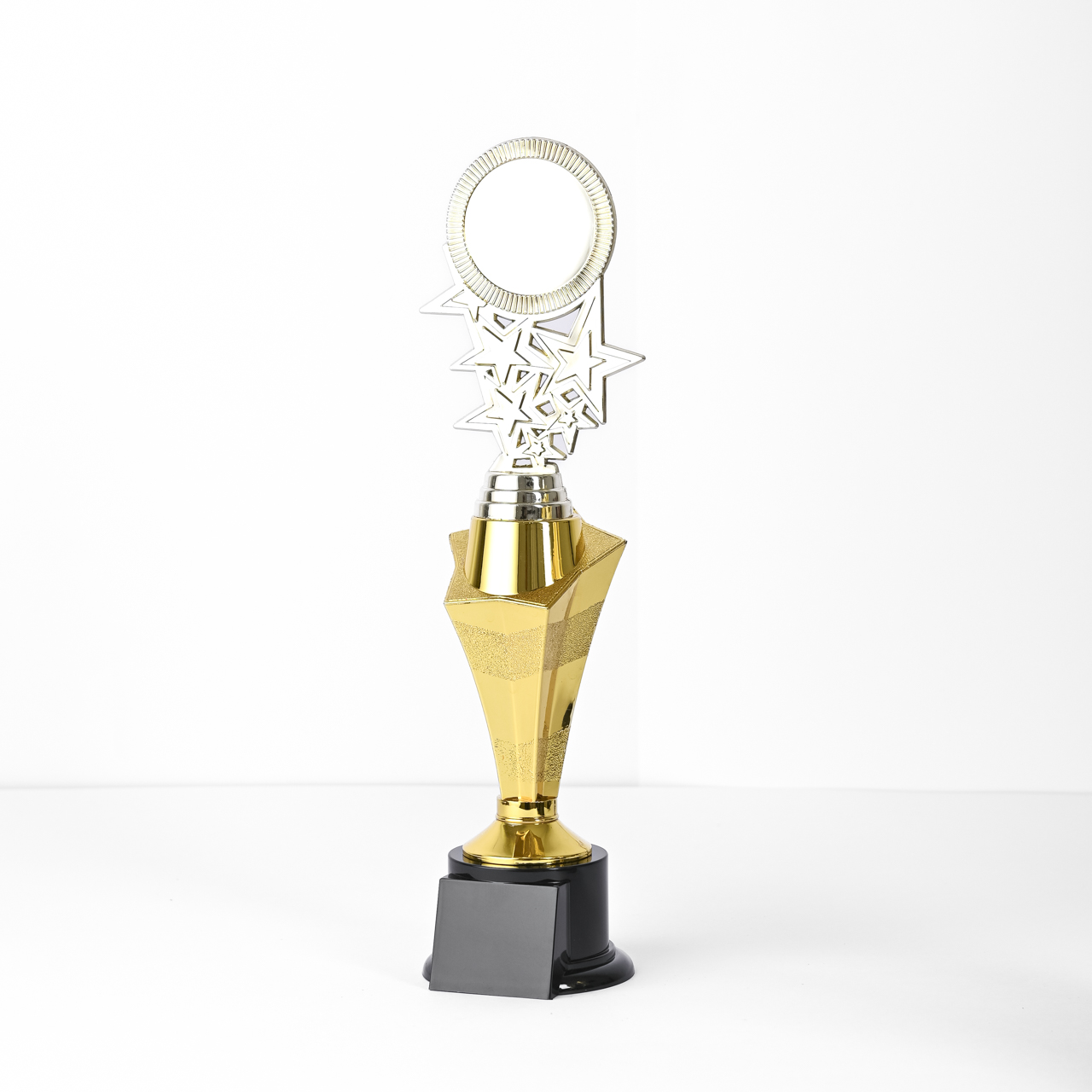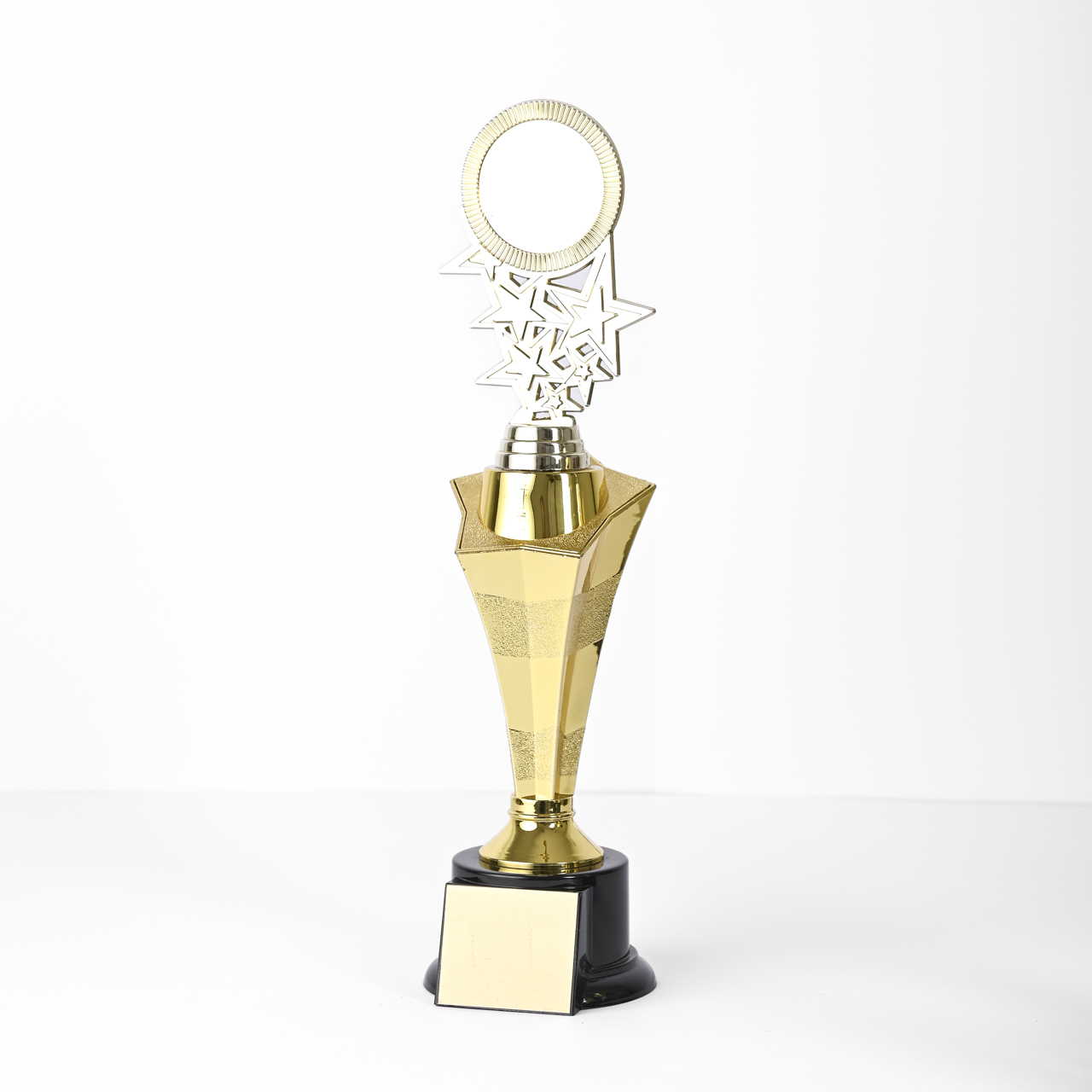 The Shining Success Trophy features a sleek black circular base with a tall star-shaped stem, culminating in a dynamic riser adorned with various sizes of stars. At the top, a gold circle is elegantly supported, perfect for personalization. Available in three sizes—small, medium, and large—this trophy celebrates outstanding achievements and recognizes those who shine brightly in their endeavors.
